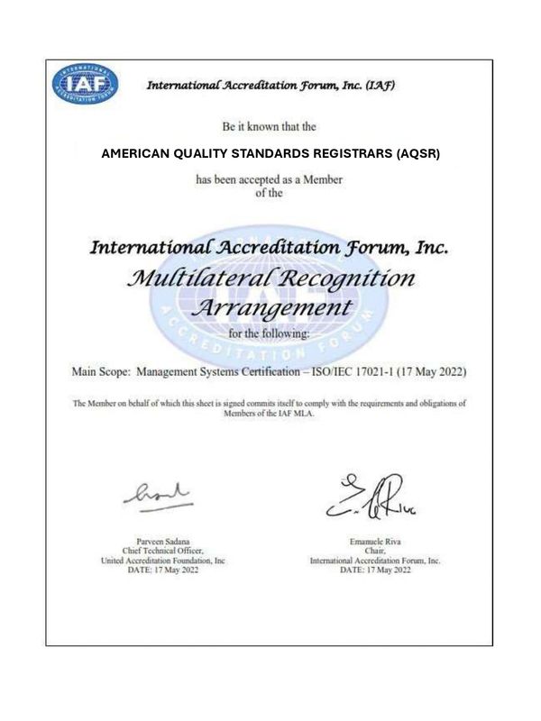 On May 17, 2022 - AQSR became a signatory of the Multilateral Recognition Arrangement for Main Scope: Management Systems Certification – ISO/IEC 17021-1 operated by IAF.