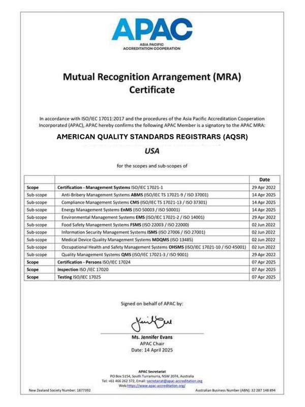 On April 07, 2025 – AQSR became a signatory of the Mutual Recognition Arrangement for following additional Scopes operated by APAC: